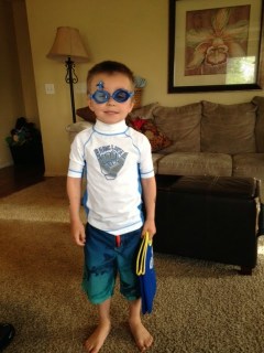 This guy cracks me up every day. I told him he needed to get dressed because he was seeing the doctor in a few hours and this was the outfit he picked out. I decided to just let him wear it because he was so worried about getting a blood test that it dominated his thoughts all morning and I don’t know how many times he mumbled, “Am I getting a bwood test?” “I don’t want a bwood test.” If wearing a swim outfit made him feel good, than I wasn’t going to argue. He ended up getting jelly all over the front of it so we had to make a last minute wardrobe change before we left for his appointment, but he did wear it to go get his hair cut earlier that morning and the lady who cuts his hair thinks he is a funny little guy: