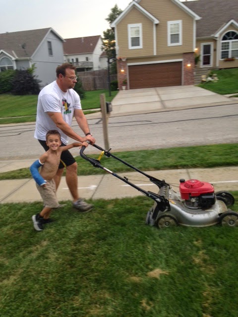 | He’s not letting the arm keep him down, helping Dad mow the lawn. |