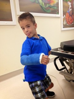 We had a follow-up appointment for his arm with Orthopedics at Children’s Mercy on Wednesday. You know you have been to Children’s Mercy a few too many times when, before we get there, your children ask you to park in the yellow submarine level of the parking garage. Those of you who have been there a few times know exactly what I’m talking about. His appointment went well, however there was a slight slant in his arm where the break was healing. They said this happens sometimes when the swelling in the arm goes down and there ends up being too much room in the cast. They had to remove part of his cast and put a wedge in to move the cast up a little bit, which then straightened out the arm. It caused quite a bit of discomfort for him, but he took it like a champ. They ended up having to wrap the cast in blue fiberglass so he was pretty excited about that. We have another follow-up in one week.